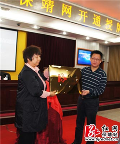 中南传媒集团董事、红网董事长、总经理、总编辑舒斌(右)为红网保靖站(中国保靖网)授牌,保靖县委常委、宣传部长、统战部长龚迎春(左)接牌。 张承印 摄