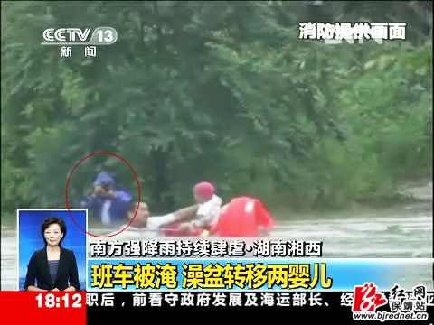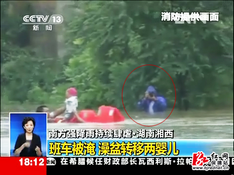 红网保靖站6月28日讯(记者 彭运生)6月27日,强降雨造成209国道花垣县望城附近的低洼路段积水很深,一辆从永顺泽家开往吉首的中巴车困在一段约50米长路面的洪流中央,发动机已熄火,进退不得。当时,花垣县消防中队官兵正全力营救车上乘客,路面水位已淹齐消防官兵下巴,淹至中巴车窗边沿。消防队员正在借助拉索,泅水用澡盆首先营救两婴儿。时不我待,正前往野竹坪镇采访的红网保靖站记者张承印看到这一幕,当即跃入洪流中,举起照相机,涉水向激流中央的营救现场靠近。