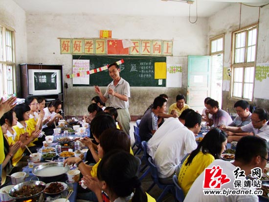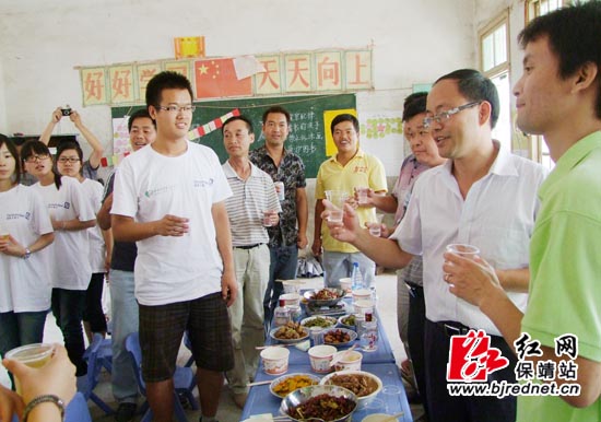 保靖县教育局局长宿云胜(右二)与全体支教队员共进午餐
