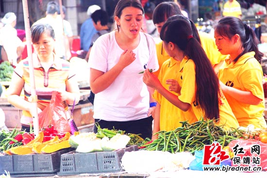 红网保靖站7月18日讯(通讯员 彭元伟 陈官芝 梁小妹)今日的保靖县菜市场格外显眼,到处都是黄与白穿梭的身影;今日的保靖县菜市场格外热闹,“How much?”、“能不能便宜一点”、“三斤五斤”入耳不绝。7月14日上午八点,集合哨声吹醒了清晨的薄雾,保靖第六届中美“好学生·闯世界”英语夏令营营员们迎着湿润的空气,从四面八方来到操场集合,各班旗手迅速整理并清点好队伍,相关负责人强调了注意事项,按照预定安排,中美学生齐奔菜市场买菜。