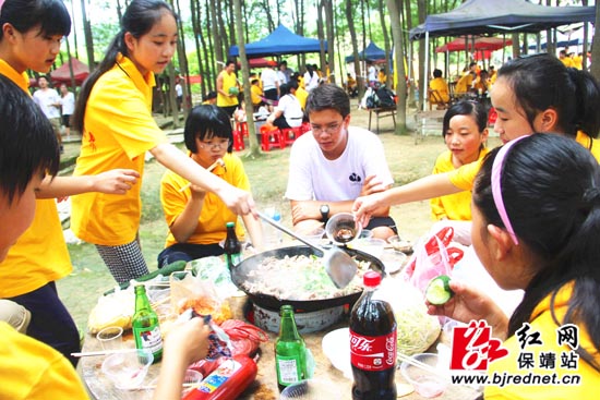 “野炊开始啦!”随着这次夏令营活动总指挥彭恩武老师的一声令下,营员们有的烧炭火,有的负责择菜、清洗,有的则拉开架势、挥勺动刀,摆出大厨的样子…整个野炊营地人声鼎沸,笑骂声、惊叫声、炭火噼啪声还有那油锅煎炒声不绝于耳,荡漾着一片片欢歌笑语。老师们也纷纷加入其中,或做技术指导或是亲自上阵炒几下,掀起高潮一阵又一阵。一个小时后,一锅锅凝结着营员们共同汗水的菜肴摆在了大家面前,大厨们则不忘摆个姿势拍照留念;有的同学早已垂涎欲滴,偷尝几口。邻桌的同学也闻香而动,端着碗来强取豪夺。吃自己做的菜就是香呀,当然,吃别人做的就更香啦!