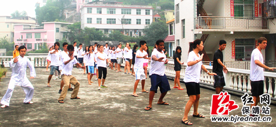 7月22日清晨,在保靖清晖苑宾馆楼顶,美国39名师生正在兴致勃勃地学练太极拳。随着陈氏太极拳简化24式的音乐响起,张拳师与大家抱拳致意,在拳师的示范指导下,“起势”、“左右野马分鬃”、“白鹤亮翅”、“左右搂膝拗步”、“手挥琵琶”……39名学员每招每式都力求到位,开合有序,刚柔相济,颇有太极拳的神韵。一套拳法练毕,大家意犹未尽,又认真地练了一组。