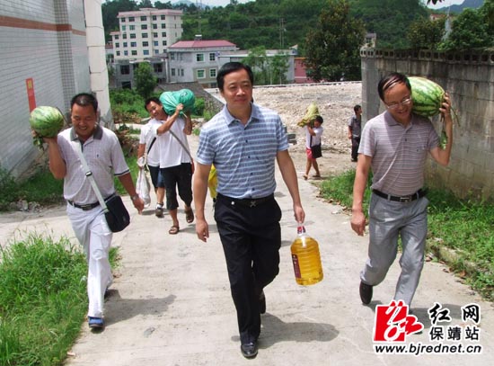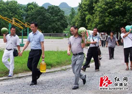 保靖县委常委、副县长宋可权(左二)带上西瓜、米油等礼物深情看望岳阳小学工程建设者们