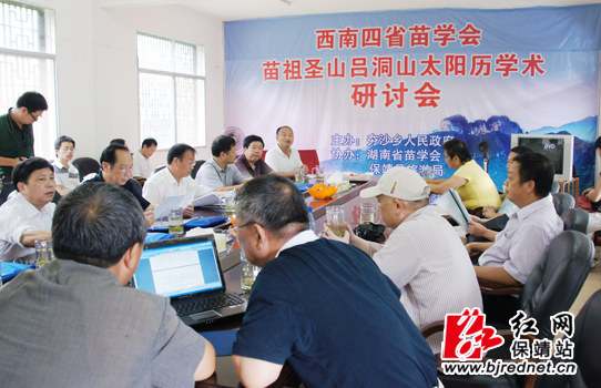 红网保靖站8月10日讯(记者:易果 张承印 通讯员:彭学东)8月7日下午5点,西南四省苗学会专家苗祖圣山吕洞山太阳历学术研讨会总结会在保靖县夯沙乡游客接待中心三楼会议室举行,会上,与会苗学会专家对此次为期四天的太阳历学术考察进行了热烈地讨论。针对吕洞山天然自成景观,以及独特神秘、神奇的人文风俗,专家们一致认定,吕洞山及周边苗寨是中国苗族远古太阳历的推演和传承圣地,吕洞山就是中国苗族神圣的奥林匹亚山。