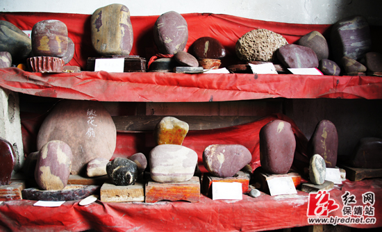 在保靖县清水坪镇清水坪村,就住着一位见证“石头神话”的奇石老人——吴中华。吴中华是抗美援朝复员军人,从他家步行至酉水河边,只要几分钟路程。屋檐下,房屋内,菜园边,全部堆砌各类奇石。老人今年77岁,淘石历史却有25年。起先,我们被老人摆放在堂屋内的一层层摆放着奇形怪状的石头所吸引,老人立即把我们引入其个人奇石馆,两间总计15平方米左右的房屋,各种造型奇特、图案清晰有趣的奇石有序排列,文字标注,供人观赏。