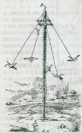 爬花杆和上刀梯为伏羲太阳神四子祭天的遗俗。花杆顶端的方框象征天门。刀梯顶端的多为连山型方牙。花杆和刀梯的拉绳,最少为三根,多者可达十六或二十四根。一索为一月,二十四根则表示二十四节气。拉索定方位,那是远古天索易历的遗俗。