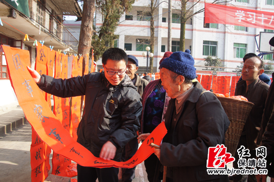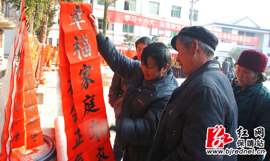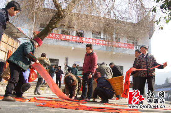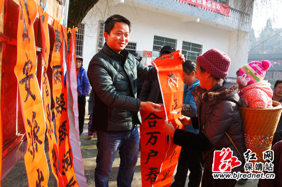 红网保靖站1月28日讯(记者 张承印 彭元伟)“真好,政府好惯实(宠爱)老百姓,还有书法家免费送春联,这样的活动非常有意义,希望今后能经常开展。”保靖普戎镇下坝村村民王顺银从镇文体广电服务站站长彭运敏手里领到免费春联喜滋滋的对记者说。