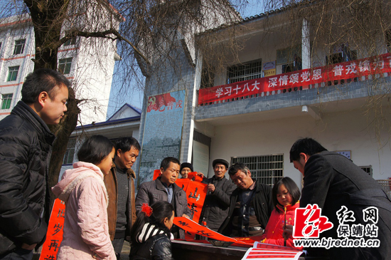 1月27日,为宣传贯彻“十八大”精神,落实文化惠民政策,普戎镇为“千家百姓”送春联活动在镇政府大院举行,彭景容、彭继文、彭开兴等多名书法家和书法爱好者免费帮助群众现场书写春联2000多幅,为大家送上新春的祝福。