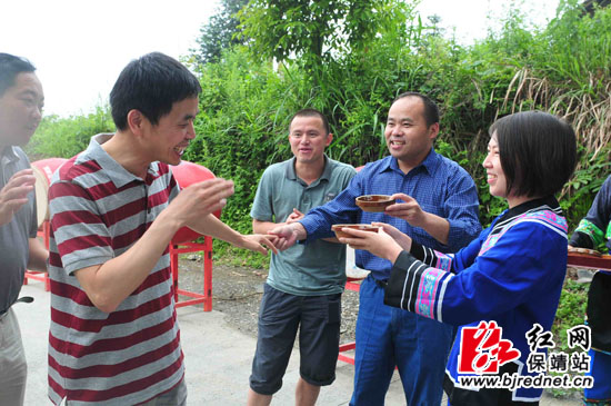 红网保靖站5月24日讯(记者 彭运生)5月21日,在保靖县人大常委会副主任梁文昌的陪同下,国家“科技列车”茶叶专家组抵达夯沙乡。在国家AA级风景区吕洞山景区的大门前,专家组遇到苗乡阿妹阿嫂的热情“拦门”。盛情难却,中国农科院茶叶研究所助理研究员邓余良博士连干了三海碗“拦门酒”,并即兴对了“拦门歌”。浓郁的民俗风情,乐了贵宾。