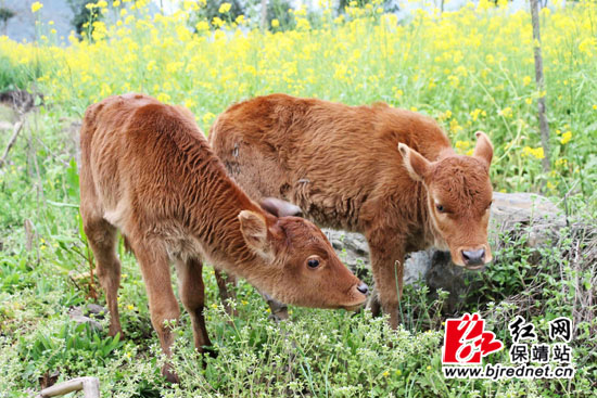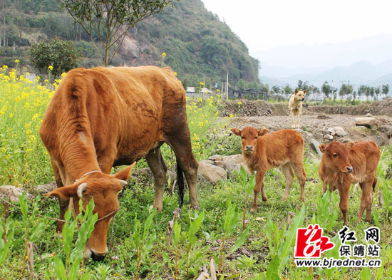 红网保靖站3月26日讯(特约通讯员 俞采华 通讯员 陈亚平)3月24日,保靖县清水坪镇坝木村杨光才家养的一头母牛和两头孪生小黄牛,正在地里悠闲地吃草。