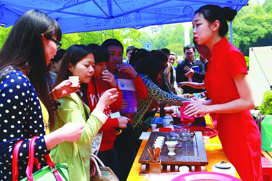 红网保靖站4月9日讯( 龙清彰)4月4日,吉首大学与湘茶集团保靖黄金茶湘西旗舰店、保靖县夯沙乡政府在吉大校园内共同举行“品味湘西茶文化、服务地方创青春”活动,旨在向来自全国各地的学生们推介保靖黄金茶和吕洞山旅游,为毕业生提供就业岗位,共谋合作赢未来。活动内容有听苗歌、看苗鼓、观吕洞山风光风情文图、赏苗族茶艺、品黄金茶饮、签就业意愿书等,吉大上千名师生与夯沙乡茶农、黄金茶经销商进行面对面交流。图为学生们在争相品尝黄金茶。