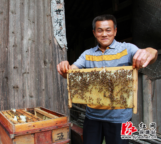 红网保靖站9月18日讯(通讯员 张文华 张家智)9月16日,保靖县毛沟镇科乐村63岁的彭启富展示自己养的蜜蜂。科乐村位于国家自然保护区白云山山麓,生态环境优美,四季鸟语花香,彭启富充分利用本地资源优势,18岁开始养蜂,积累了丰富的养蜂经验,现在房前屋后养蜂49箱,年纯收入4万余元。