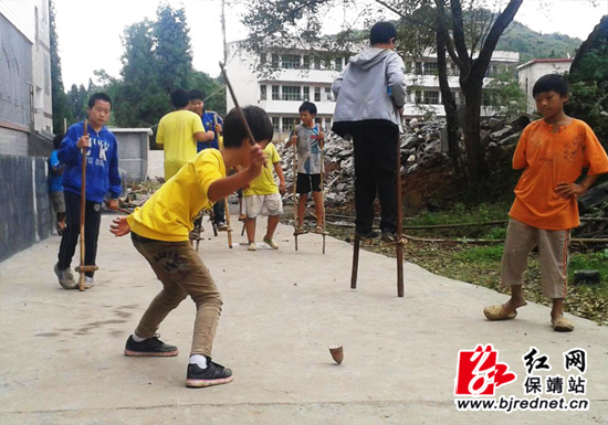 红网保靖站10月23日讯(通讯员 向红星)保靖县花桥中学在体育教学上锐意改革,把一些民间游戏元素引入体育课堂,鞭陀螺、踩高跷、蛙跳接力赛、跑捡乒乓球等新型教学形式,让孩子们兴趣倍增、乐不思蜀,让学生在游戏中不知不觉地锻炼身体,增强体质。
