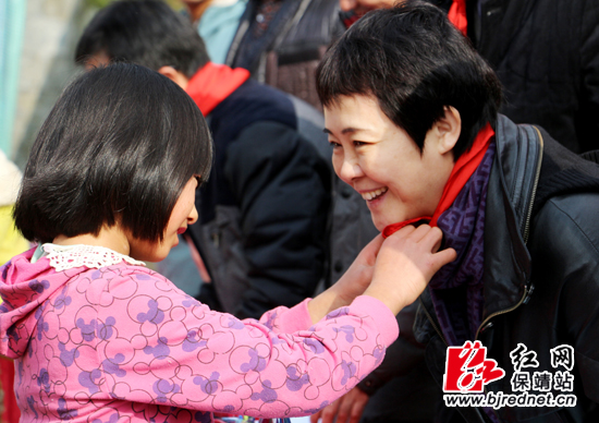 少先队员为爱心人士佩戴红领巾 龙敬 摄