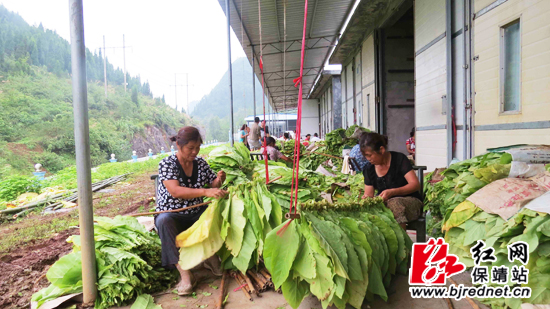 红网保靖站7月8日讯(通讯员 赵阳顺 彭善春 彭磊)7月3日,保靖县阳朝乡4000多亩烟叶进入烘烤阶段。该乡政府积极帮助烟农协调烤房,确保烟叶顺利烘烤。图为阳朝乡甫吉村烟叶种植大户彭章与工友一起采割烟叶,准备分级编杆送入烤房烘烤。