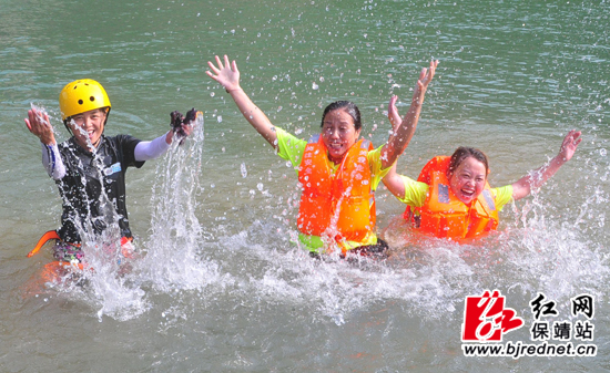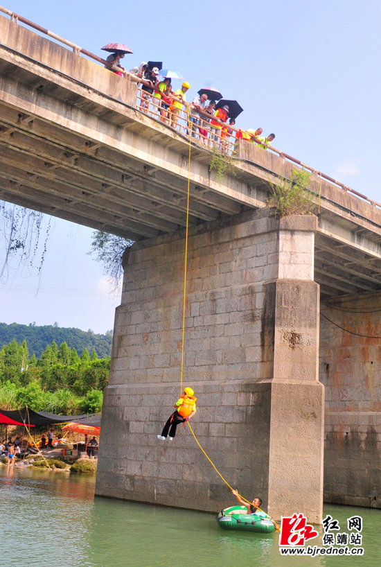 在现场,速降爱好者身着救生衣,头戴安全帽,身系安全绳,争前恐后地从桥上实施速降。其中,6位保靖籍美女驴友也巾帼不让须眉,体验“空中飞人”的感觉,完成了桥梁速降。