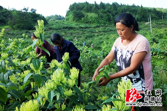 红网保靖站7月9日讯(特约通讯员 俞采华 通讯员 陈亚平) 7月7日,保靖县清水坪镇村民正在采摘金银花。近年来,该县狠抓石漠化治理力度,根据不同海拔栽种金银花等经济类林木,将昔日的荒山打造成农民增收的金山银山。