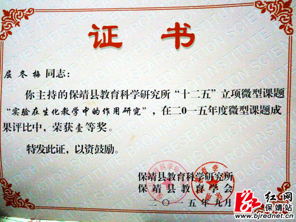 11月16日,保靖花桥中学传来喜报,该校3位老师的县级微型课题顺利结题,并分获县一等奖、二等奖。其中屈冬梅老师的《实验在生化教学中的作用研究》、彭桂银老师的《初中语文课堂教学中文言字词积累的策略研究》获一等奖,张敏老师的《湘西当前农村美术教学的现状研究》获二等奖。(向红星)