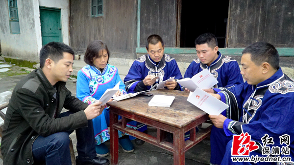 图为11月13日,清水乡纪委书记吴光斌在土家山寨蓬桂村为几名党员作《准则》和《条例》讲解。