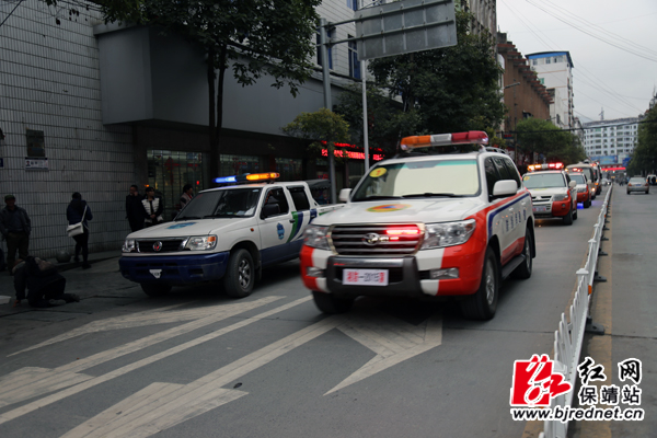 “湘防--2015”全省人防机动指挥车队在保靖县城大街进行拉练
