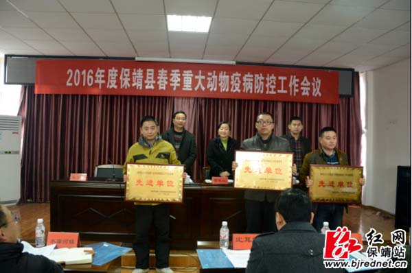 会议还分别对保靖县2015年重大动物防疫工作先进单位和先进个人进行表彰奖励;各乡镇领导向葛晓红副县长递交了《保靖县2016年度重大动物疫病防控工作目标管理暨畜禽水产品质量安全监管工作责任状》。