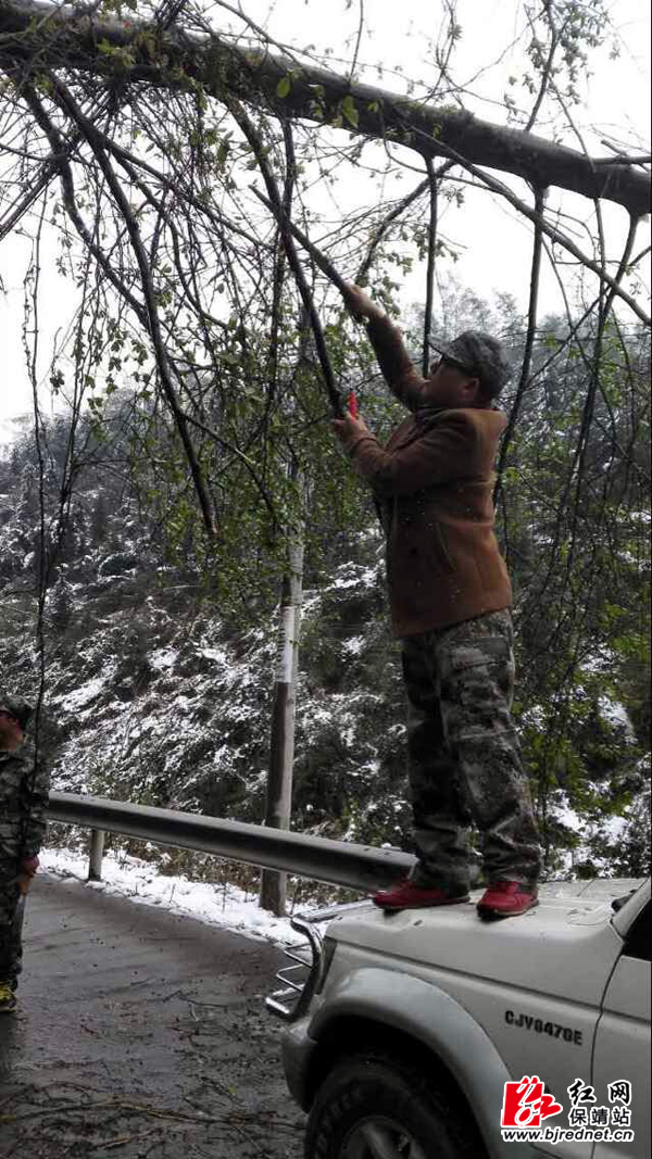 红网保靖站3月17日讯(通讯员 陈章伟)3月15日,受突降大雪影响,保靖县长潭河乡境内公路两旁多处树木被大雪压断,横压在道路上空,导致电力中断,并严重影响道路畅通,危害车辆行人通行安全。
