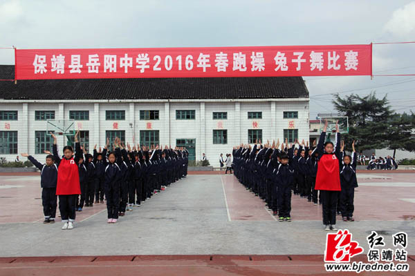 “强健体魄、超越自我!” “九六九六,力争优秀!”近日,一声声高亢激昂的口号声响彻保靖县岳阳中学校园上空,保靖岳阳中学正在举行大课间比武活动-----跑操和兔子舞比赛。