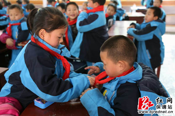 “老”队员在为新队员系红领巾