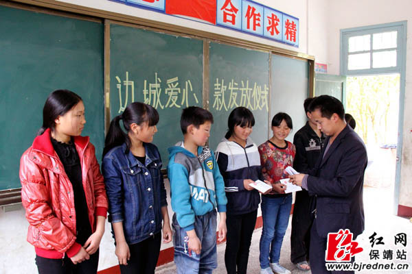 4月5 日,保靖县马王小学的贫困留守儿童在领取边城爱心协会送来爱心款。