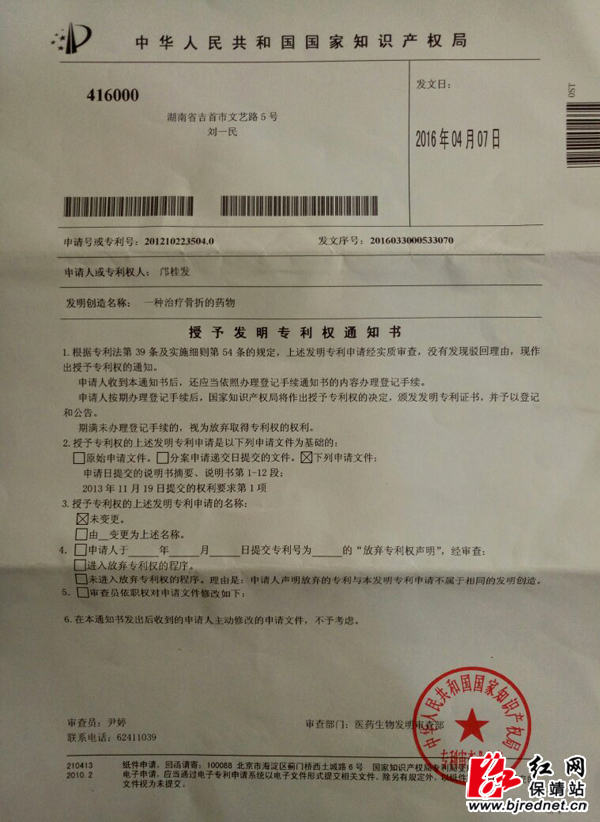 2012年6月18日,在保靖县知识产权局的帮助下,邝桂发向国家知识产权局申请了“一种治疗骨折的药物”专利发明,申请号为201210223504.0。