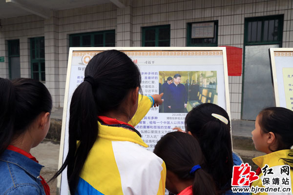 县委常委、宣传部部长尹海霞与学生一起观看展板