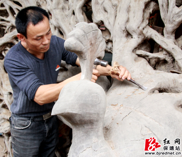近日,笔者慕名来到石军家中,刚一进院子就被形态各异的根雕半成品吸引了,特别引人注目的是放在门前的一只大孔雀,浑然天成。在堆满枯树根的庭院里,笔者找到了正忙碌着的石军。提起石军怎么会迷上根雕,那还得从二十几年前的一天说起,石军下街赶场无意间看到了摆在街边的几件根雕作品,在同根雕老板交谈和观赏根雕作品中,石军对根雕产生了浓厚兴趣。他想,平时当柴烧的树桩稍做加工打磨竟然可以成为艺术品,还可以赚钱养家,于是就下定决心搞起了根雕,为了创作精美的作品,他拜师学习绘画艺术,多次走出去观摩学习,没想到这一干竟干了近二十几年。