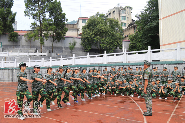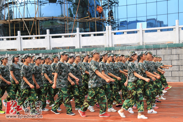 “双腿要加紧,昂首挺胸,目视前方,中止对准裤缝线……”操场上,同学们穿着崭新的迷彩服,在烈日下接受教官的训练指导。一颗颗汗珠从同学们的脸上渗出……