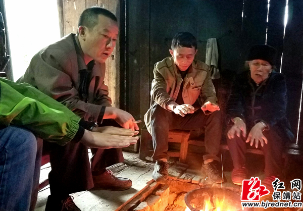 坐在火坑边跟联系户扯家常,商讨下一步脱贫办法