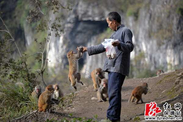 红网保靖县分站11月16日讯(记者 易果 张承印) 11月15日,保靖县吕洞山镇西游村的深山中,一群野生猕猴围绕村民石志安,以及部分游客身边,觅食嬉戏。