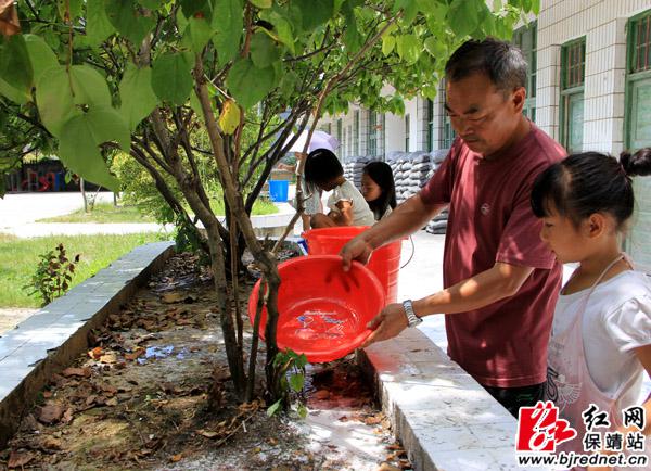 暑假,李老师为校园的树木“解渴” 彭彪 摄