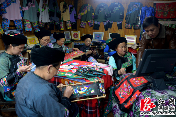 保靖县吕洞山阿丫阿嫂苗绣合作社的绣娘们正在进行苗绣 张承印 摄