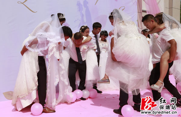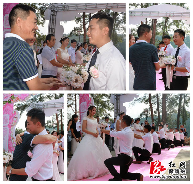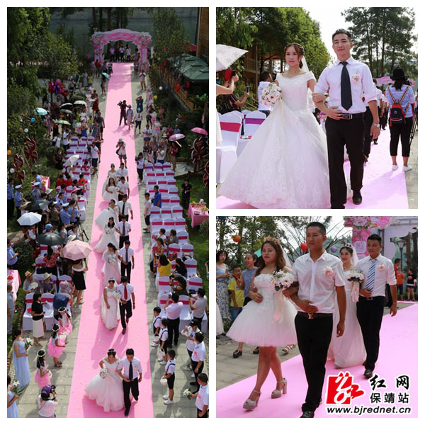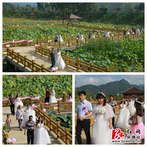 在荷花妖娆动人的池塘边,7对新人身着漂亮的婚纱礼服,心系彼此,在长辈的陪同下,在全场所有人的关注下,踏上红地毯,沿着荷花池走向典礼台,静候幸福时刻的到来。主婚人从嘉宾席走上台,伴郎、伴娘手持百合花为新人打开幸福通道。新郎手持捧花走上舞台,走至公主亭,面对长辈站定,向长辈鞠躬,长辈将新娘的手交给新郎。新郎面对新娘单膝下跪求婚,送上捧花,新娘扶起新郎,两人手挽手走进典礼台向来宾鞠躬致谢。在众亲友祝福声中,新人依次表达爱的宣言,互换婚戒,拥抱亲吻,在印泥上印上手印,新人手挽手喝交杯酒……新颖的西式婚礼吸引了不少人的眼球,赢得掌声阵阵。