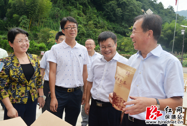 当天下午,调研组还来到了迁陵镇大田村黄金茶基地及保靖县鼎盛黄金茶开发有限公司茶厂,了解基地规模、茶叶品种、产量、人力成本、加工方式、销售模式及市场行情,观看茶厂的茶叶及加工设备,还现场品尝保靖黄金茶,并给予高度赞扬,他充分肯定了手工制茶的加工方式,并就黄金茶如何更好地销售提出了建设性的意见。