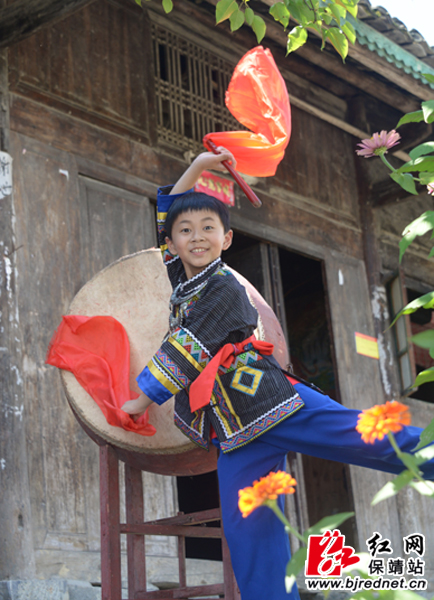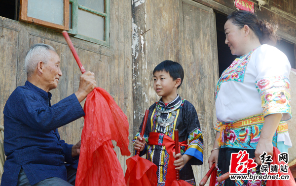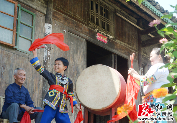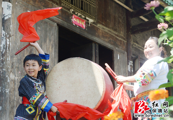 红网保靖县分站9月13日讯(记者 易果 张承印 张坤)为了迎接党的十九大召开以及60周年州庆,保靖县葫芦镇米塔村,《苗族鼓舞》国家级代表性传承人洪富强与鼓弟子龙梅翠(女)、以及龙梅翠的儿子彭博一起跳起苗族鼓舞,以特别的方式喜迎盛事。