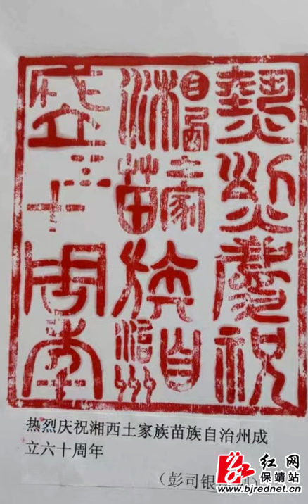 红网保靖县分站9月18日讯(通讯员 贾昶)为庆祝湘西土家族苗族自治州成立六十周年,保靖县碗米坡镇年届七旬的农民彭司银,运用自己的业余爱好,镌刻了一枚“热烈庆祝“湘西自治州成立六十周年”的印章,以表达自己对州庆的激动心情。
