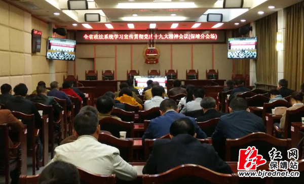 红网保靖县分站11月4日讯(通讯员 田方)11月2日,湖南省政法系统学习宣传贯彻党的十九大会议在长沙召开,保靖县政法系统各单位、综治委成员单位70余人参加视频会议。县委常委、政法委书记宋垚彪,县人民政府副县长、公安局局长石绍峰,县检察院检察长杨庆华、县法院院长龙鸥玲、州碗米坡公安分局局长田维芬出席会议并参与学习。