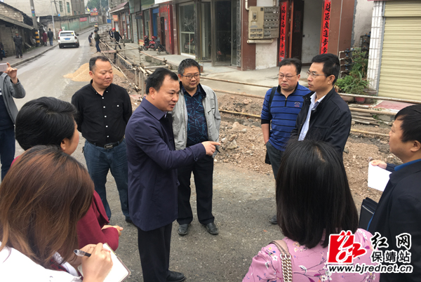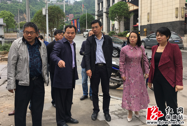 湘西土家族苗族自治州副州长麻超(中)一行调研迁陵小学门口污水管网铺设情况