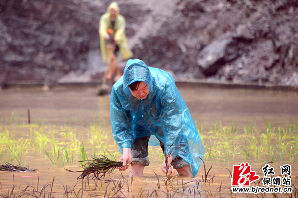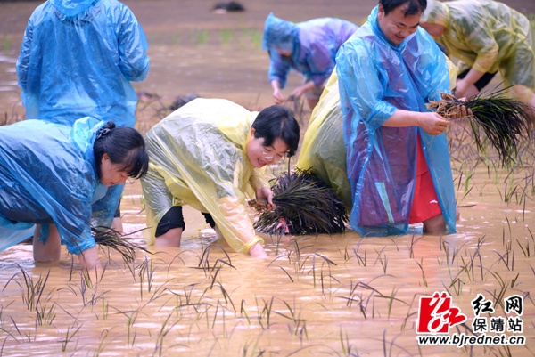 县委副书记、县长杨志慧(中)带领百余党员冒着大雨俯下身子在秧田插秧