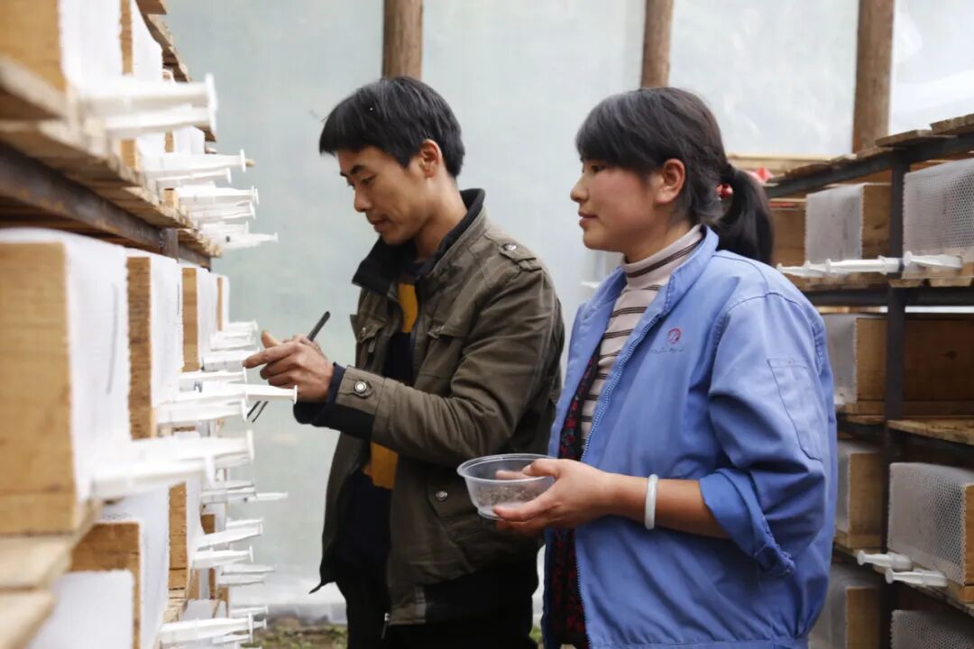 培育室里,颜召辉正在培育蜂王。她介绍,一个胡蜂包的生长周期在半年左右,阴历五月份引进挂山,分别在八、九月份收割一次,利润还不错,只要有合适的山沟散养,是一个非常不错的脱贫致富项目。合作社培养的初级蜂群发放给农户,他们拿回去就可以挂在山林养殖了,希望这么好的产业可以让更多的老百姓创收,让更多未成家的年轻人参与进来,一起发家致富。