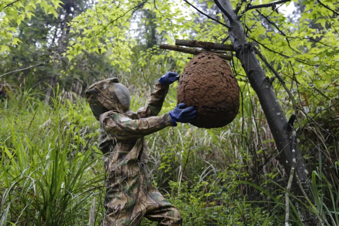 “蜂巢都挂在人迹罕至的山林,周围设置有警示牌和警戒线。”